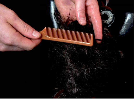 First, we're going to get the hair system a little bit wet and then we begin working out knots in any adhesive that is stuck inside the unit. In order to do this, what we are going to do is to take our hair system and brush and begin at the ends of the unit. Then we are going to start brushing the hair. And this right here is a very important stage, but it's something that we've got to do correctly. Because if we don't do it correctly, we can pull a lot of hair out. So in order to do it correctly, what we do is grabbing halfway up the hair instead of grabbing by the base. And we're doing this because we do not want to put tension on the knots of the hair system. If we do, there's a chance that it could definitely come out and we could lose a lot of hair.