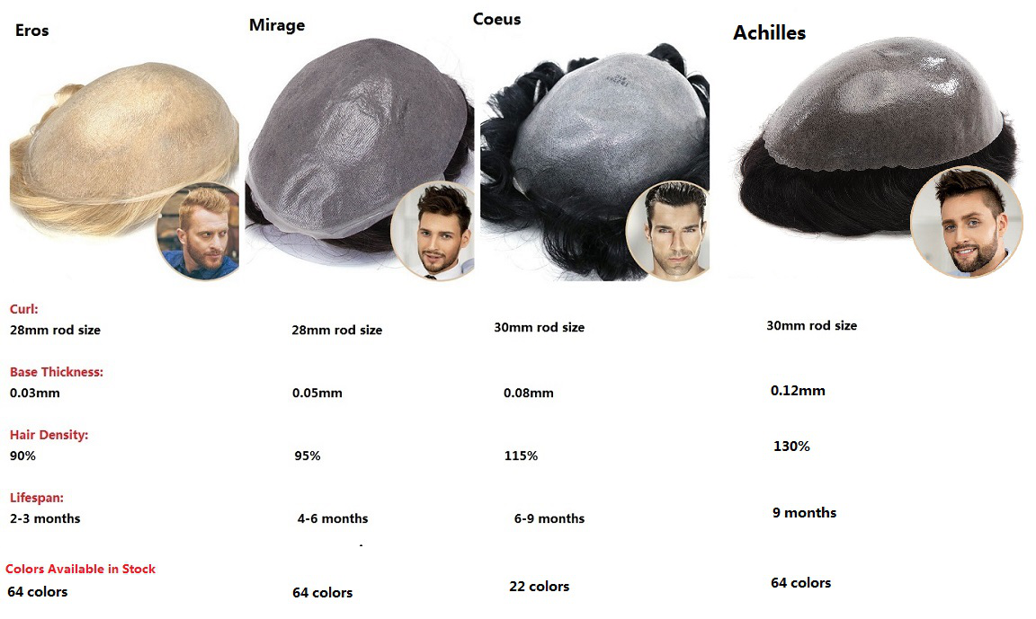 The 4 poly toupees are Eros, Mirage, Coeus and Achilles. From the below picture, you can check the different properties in aspects of Curl, base thickness, hair density, lifespan and available colors.
