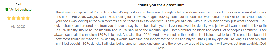 Quote: ‘Thank you for a great unit it's the best I had it's my first system from you. I bought a lot of systems some were good others were a waste of money and time. But yours was just what I was looking for. I always bought stock systems but the densities were ether to thick or to thin. When I found your site I was looking at the skin systems cause there easier to work with. I saw you had one with a 115% hair density just what I needed. So I took a chance and ordered one from you. I have to say it's the best hair system I ever received the density was just what I wanted not too thick or thin. 115% density should be the medium and 110 % should be the medium light. I been around the block and read a lot of people's comments. They always complain the medium 130 % is to thick And also the 120 %. And they complain the medium light is just that to light. The one I just bought is how most should be made 115 % density it would save time and money for the seller and buyer. That's just my opinion. As long as I can buy this unit I just bought 115 % density I will stay being another happy customer and the price stays around the same. I will always but from Lavivid...God Bless.’