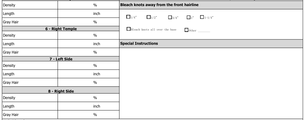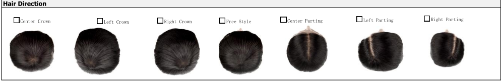 Here is how you fill in this custom made hair system order form. If this is still difficult for you, we can talk on the phone and discuss different options. Give us a call at Monday-Friday, 9:00 AM – 5:30 PM PST, TEL: 626-581-9123 Monday-Friday, 5:30 PM – 2:30 AM PST, TEL: 909-895-6421. We will have professional customer service to guide you to fill out the form