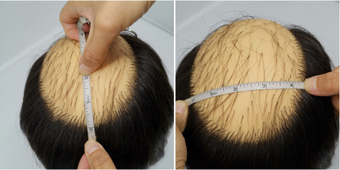 Measure the width where is 2’’ vertically from the edge of your hair loss area in the back towards the top of your head.