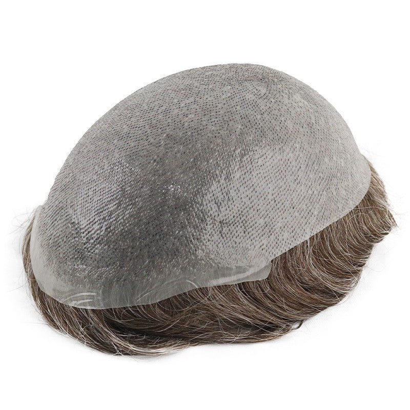 The base of the Zeo-Single Knot Mirage measures between 0.06 to 0.08mm, featuring a full thin skin construction. Employing the V-looping technique along the front hairline ensures a remarkably natural appearance, allowing for versatile styling such as slicked-back hairstyles. To enhance durability and minimize shedding, single split knots are utilized throughout the rest of the base. This meticulous craftsmanship ensures longevity, surpassing that of a full v-looped skin hair system.