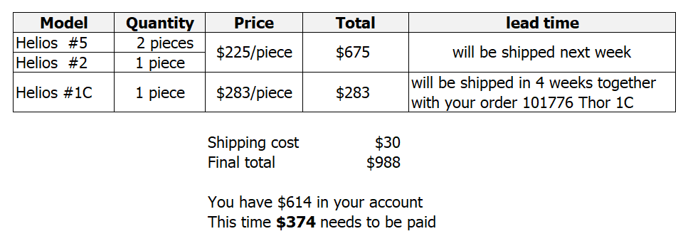 The shipping charge for bulk wholesale orders is $30 for 1 piece, plus $3 for each additional.