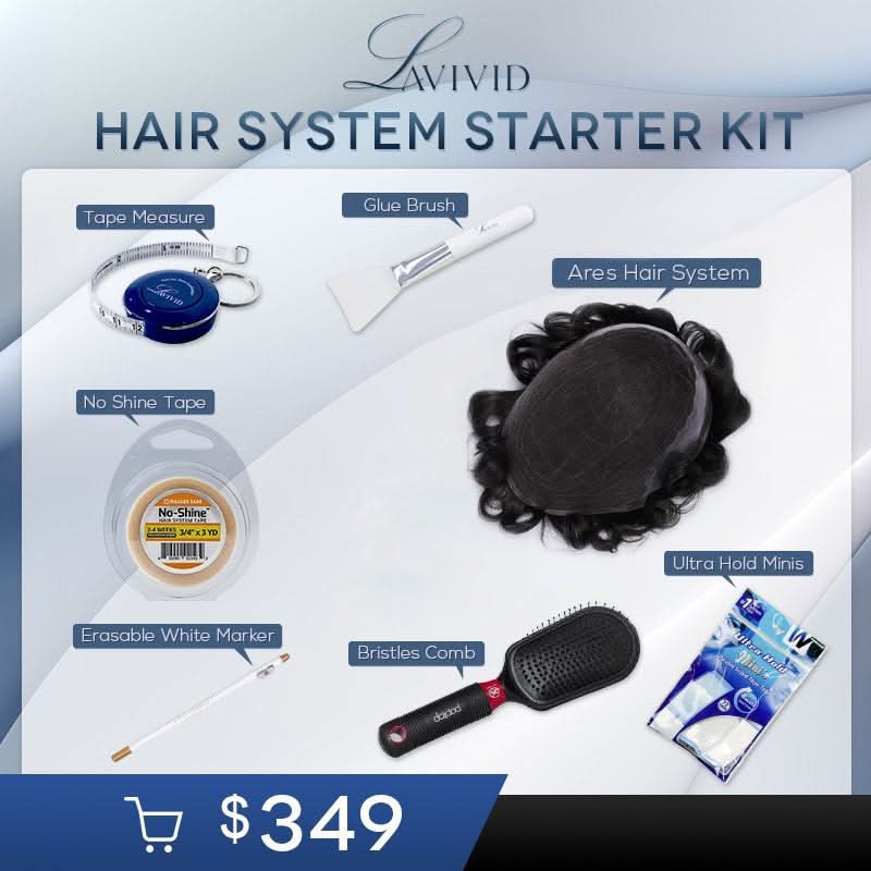 Our starter kit includes our best-selling hair system, the breathable Ares Hair System, along with additional items:
