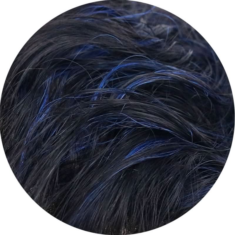Zayn Blue highlighted hair system incorporates bold chunks of ultramarine blue color into black hair to create a unique and eye-catching hairstyle that's sure to turn heads.